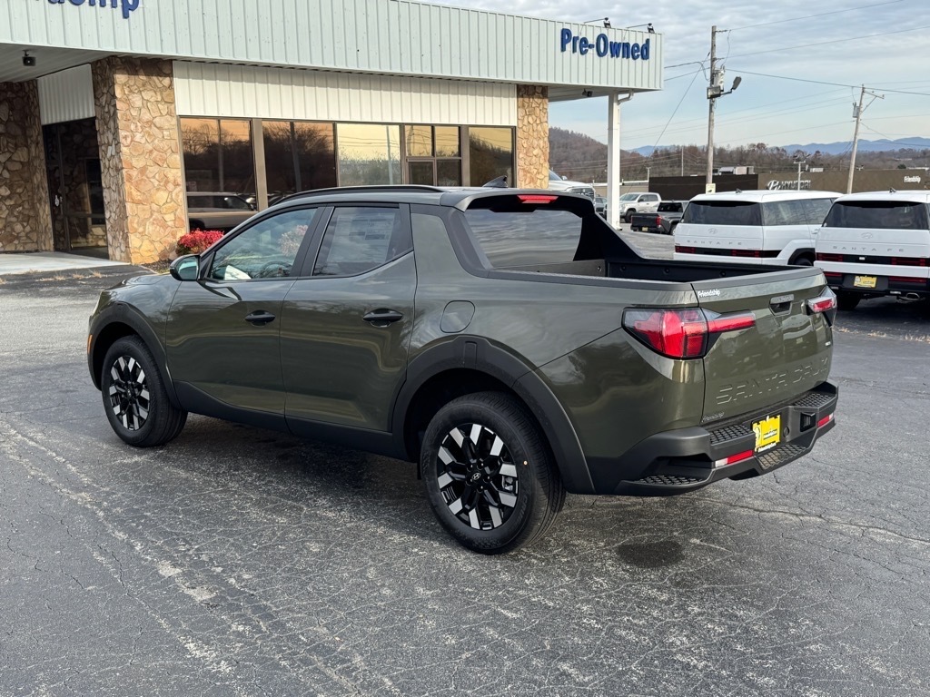 INFORMATION ABOUT THIS VEHICLE AND IT FEATURES:. Option Group 01, 18x 7.5J Alloy Wheels, 4-Wheel Disc Brakes, 4.081 Axle Ratio, 6 Speakers, ABS brakes, Air Conditioning, Alloy wheels, AM/FM radio: SiriusXM, Apple CarPlay & Android Auto, Auto High-beam Headlights, Auto-leveling suspension, Automatic temperature control, Bed Cargo Net, Brake assist, Bumpers: body-color, Camera Mount, Cargo Net, Carpeted Floor Mats, Compass, Delay-off headlights, Driver door bin, Driver vanity mirror, Dual front impact airbags, Dual front side impact airbags, Electronic Stability Control, Emergency communication system: Bluelink , Exterior Parking Camera Rear, Fender Flares, First Aid Kit, Four wheel independent suspension, Front anti-roll bar, Front Bucket Seats, Front Center Armrest, Front dual zone A/C, Front reading lights, Fully automatic headlights, H-Tex Leatherette Seat Trim, Heated door mirrors, Heated Front Bucket Seats, Heated front seats, Illuminated entry, Low tire pressure warning, Occupant sensing airbag, Outside temperature display, Overhead airbag, Overhead console, Panic alarm, Passenger door bin, Passenger vanity mirror, Power door mirrors, Power driver seat, Power steering, Power windows, Radio data system, Radio: AM/FM/HD Audio System, Rear anti-roll bar, Rear reading lights, Rear side impact airbag, Rear step bumper, Rear window defroster, Remote keyless entry, Security system, Speed control, Speed-sensing steering, Split folding rear seat, Spoiler, Steering wheel mounted audio controls, Tachometer, Telescoping steering wheel, Tilt steering wheel, Traction control, Trip computer, Turn signal indicator mirrors, and Variably intermittent wipers. Rockwood Green 2026 Hyundai Santa Cruz SEL AWD 8-Speed Automatic with SHIFTRONIC 2.5L I4 21/29 City/Highway MPG